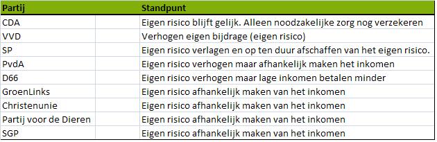 Omdat er verkiezingen aankomen is het nog niet helemaal zeker of het eigen risico daadwerkelijk met 130 euro omhoog gaat. De verschillende partijen hebben een eigen standpunt betreft het eigen risico. In onderstaand schema is kort weergegeven hoe de politieke partijen over het eigen risico denken.