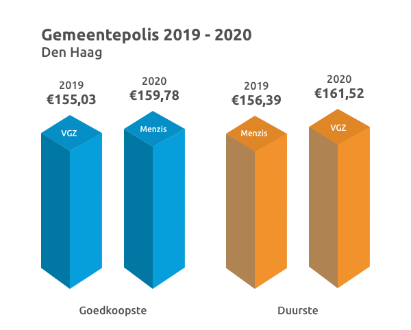 Onderstaand voorbeeld laat het verschil zien tussen zorgverzekering 2019 en zorgverzekering 2020 voor de Haagse minima. De dekking van zowel de tandarts als de fysiotherapeut is hetzelfde gebleven, maar toch gaan de minima in Den Haag bijna €6.50 per maand meer betalen als ze de polis van VGZ hebben – waarmee de polis van VGZ de duurste wordt. De stijging van de premie wordt deels opgevangen door een hogere zorgtoeslag in 2020. Die gaat tot 5 euro per maand omhoog voor alleenstaanden, en met 4 euro voor mensen met een toeslagpartner.
