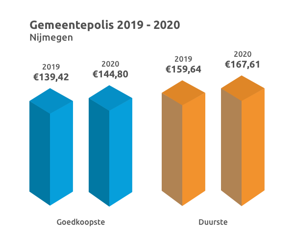 Minima in Nijmegen gaan volgend jaar 5,56 euro meer betalen voor de collectieve zorgverzekering die ze via hun gemeente bij VGZ hebben afgesloten. Minima in Nijmegen kunnen ook kiezen voor CZ. Voor het goedkoopste pakket van CZ stijgt de premie met €7,41 naar 148,09. Dat komt omdat de korting van beide zorgverzekeraar volgend jaar meer dan gehalveerd wordt. Daarnaast stijgt de premie. De premie voor de goedkoopste polis wordt in 2020 €144,80 (VGZ Compleet). In 2019 betaalde verzekerden voor hetzelfde pakket €139,24. Dit blijkt uit een analyse van de polissen van de minima door ZorgKiezer.nl.