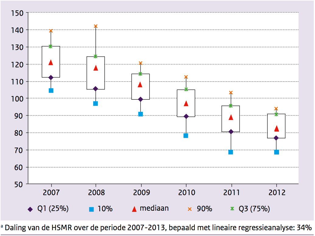 Voor de 61 ziekenhuizen in de analyse is het gemiddelde van de HSMR over alle jaren op 100 gesteld. In 2007 lag de gemiddelde sterfte van de ziekenhuizen nog 21% boven de verwachte waarde. In 2012 lag deze 18% onder de verwachte waarde. De gemiddelde waarde is over de periode 2007-2012 met 34% gedaald. Ziekenhuizen met de hoogste sterfte in 2012 zaten ongeveer op het niveau van de ziekenhuizen met de laagste sterfte in 2007.