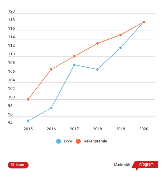 Het is een fikse premiestijging die velen niet aan zagen komen én die de lijn der verwachting doorbreekt. De afgelopen jaren bleef de verzekeraar altijd een paar euro onder de nominale rekenpremie zitten. In 2020 wordt dit gat gedicht en is het verschil slechts nog een paar cent. Waar het kabinet een premiestijging van 3 euro had berekend, stijgt de premie van DSW maar liefst met 6 euro. Hierdoor ligt de premie van de verzekeraar (118 euro) nu bijna even hoog als de rekenpremie. (118,42 euro).