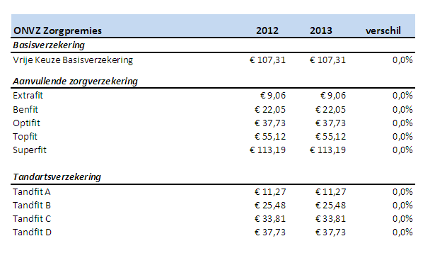 De ONVZ premies van zowel de basisverzekering als de aanvullende zorgverzekeringen voor 2013 blijven gelijk aan de premies van 2012. De premie voor de basisverzekering blijft € 107, 31.