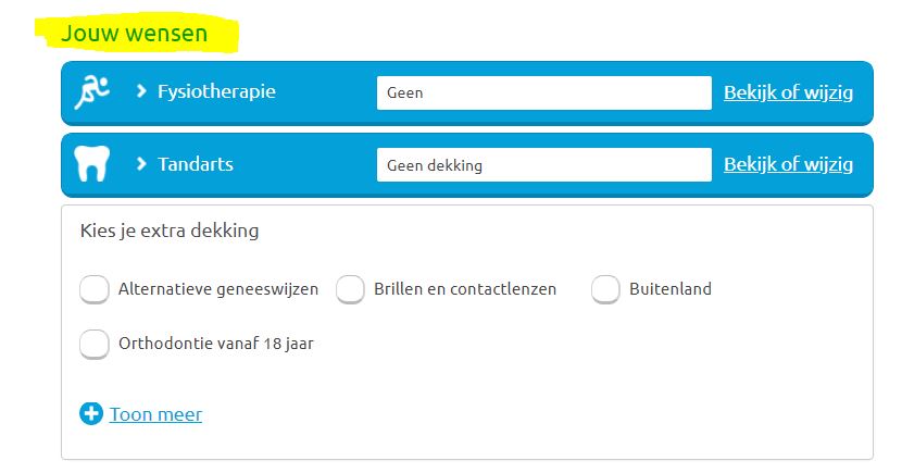 • Tandarts (dental care): covers the selected percentage/amount of dental costs per year.