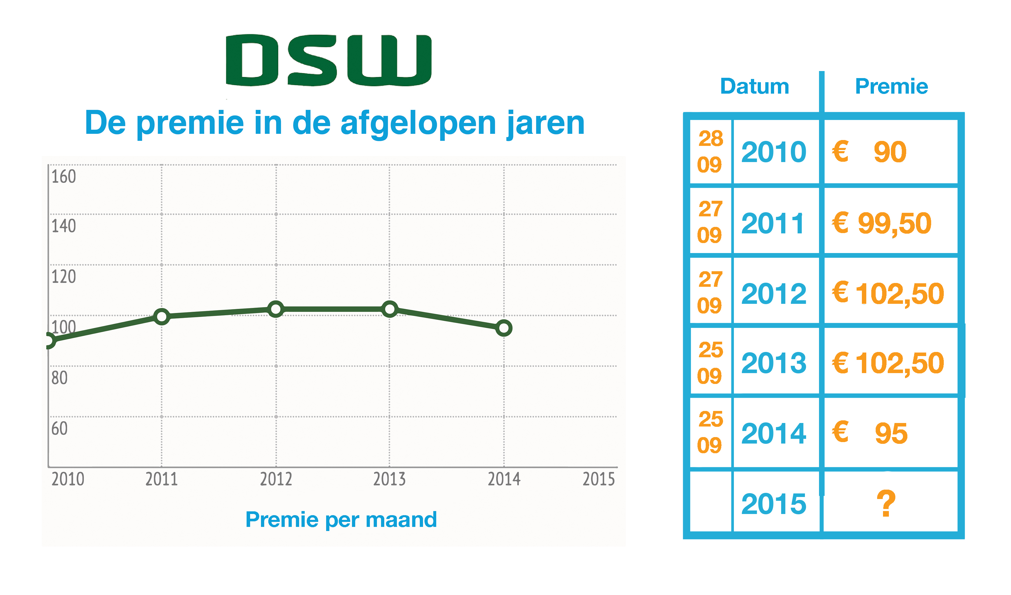 DSW zit sinds de komst van de basisverzekering steevast onder de gemiddelde basispremie. De afgelopen jaren is het verschil groter dan na de invoering hiervan. Dit komt doordat grote verzekeraars eerst nog bereid waren om wat verlies te draaien. Nu komen ze daar van terug. De premie van DSW geeft een goede indicatie van hoeveel de basispremie dit jaar zal stijgen.