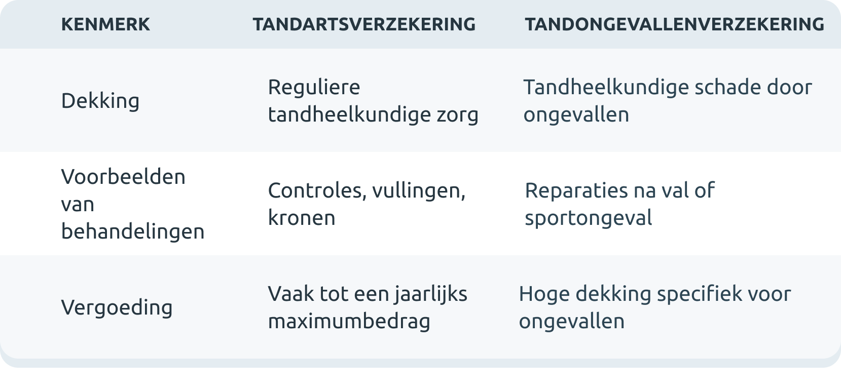 Een tandartsverzekering dekt reguliere tandheelkundige zorg, zoals controles, vullingen en kronen. De kosten worden vaak gedeeltelijk vergoed tot een maximumbedrag per jaar. Deze verzekering is bedoeld voor geplande behandelingen en preventieve zorg. Een tandongevallenverzekering daarentegen dekt schade aan het gebit die ontstaat door een ongeval. Denk hierbij aan een val of sportblessure. De dekking is meestal uitgebreider omdat de kosten voor herstel bij ongevallen hoger kunnen zijn.