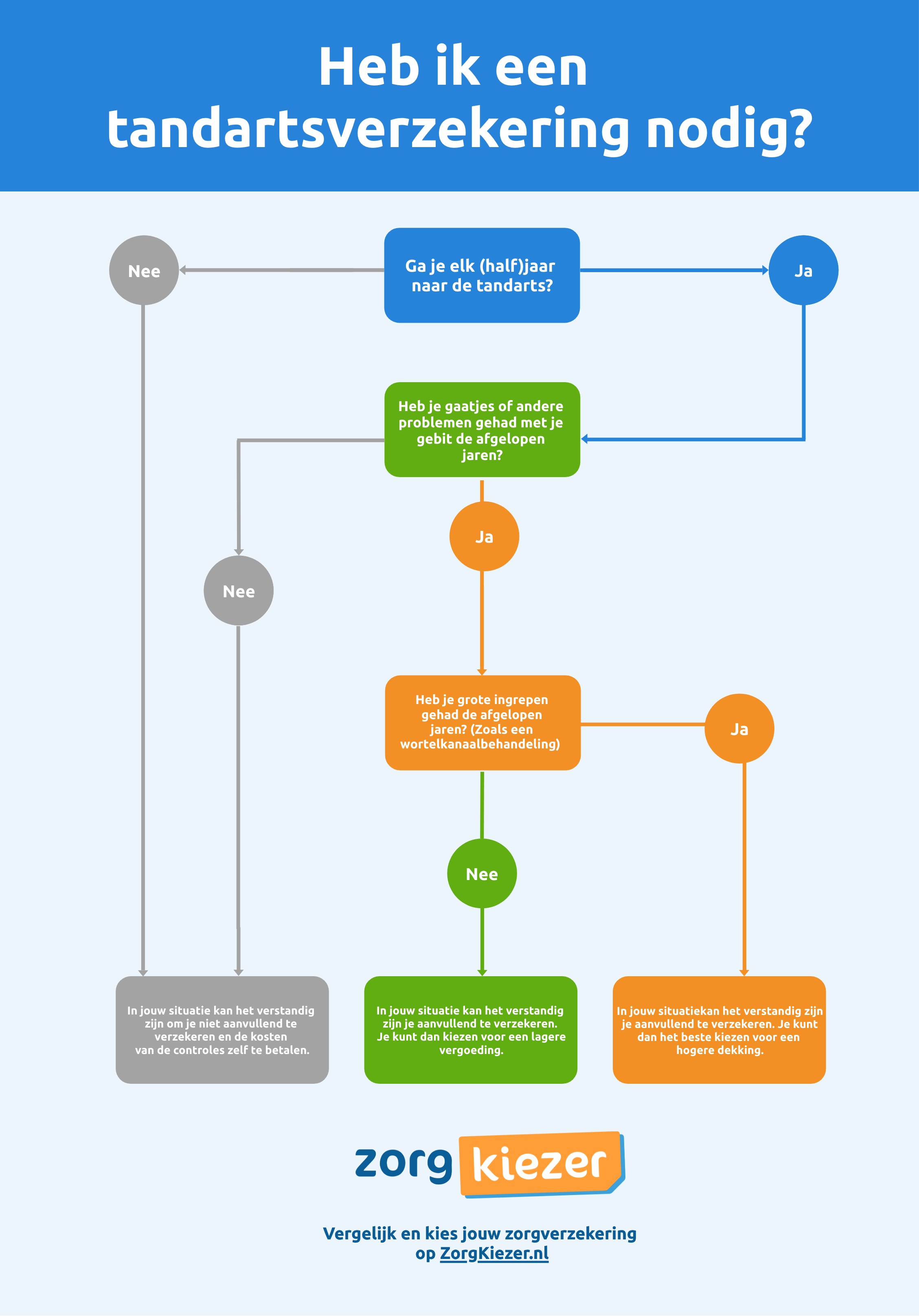 Het is niet voor iedereen verstandig om een aanvullende zorgverzekering af te sluiten. Als je een gezond gebit hebt, moet je vaak meer premie betalen dan je aan vergoeding ontvangt. Een tandartsverzekering kan voordelig zijn voor mensen met een slecht gebit of specifieke behoeften, regelmatige tandheelkundige behandelingen nodig hebben of orthodontische zorg verwachten. Het kan moeilijk zijn om voor je eigen situatie in te schatten of je een aanvullende verzekering nodig hebt. Om je te helpen bij deze keuze heeft ZorgKiezer een handige keuzehulp opgesteld.