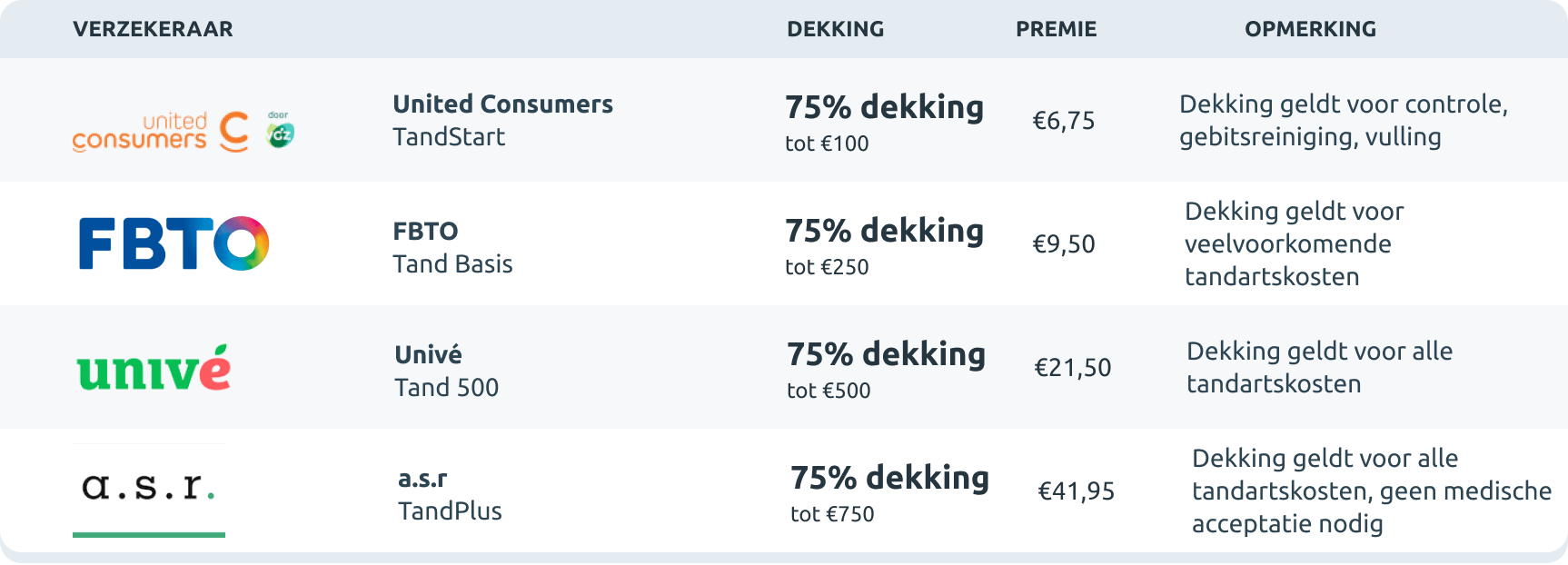 Ben jij van plan om een tandartsverzekering af te sluiten? Dan is het goed om te kijken wat de beste tandartsverzekering is voor jou. Zie hieronder de goedkoopste tandartsverzekering per dekking