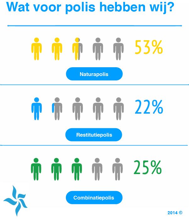 Er zijn een drietal opties waar je uit kunt kiezen: de naturapolis, de restitutiepolis of de combinatiepolis. Het afgelopen jaar kozen veruit de meeste verzekerden voor een naturapolis, ruim 53%. 25% had een restitutiepolis en 22% van de verzekerden had een zogenaamde combinatiepolis.