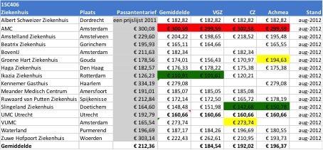 ZorgKiezer.nl vroeg steekproefsgewijs tariefgegevens op bij 16 verschillende ziekenhuizen in heel Nederland. Er is gekozen voor vier behandelcombinaties tarieven op te vragen met per behandeling de gecontracteerde tarieven bij de drie grootste zorgverzekeraars (Achmea, VGZ en CZ). De peildatum van de tarieven is augustus 2012.