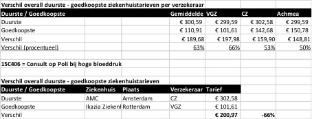 Hieronder de verschillen tussen ziekenhuizen en zorgverzekeraars in het tarief voor een controle op de polikliniek bij hoge bloeddruk.