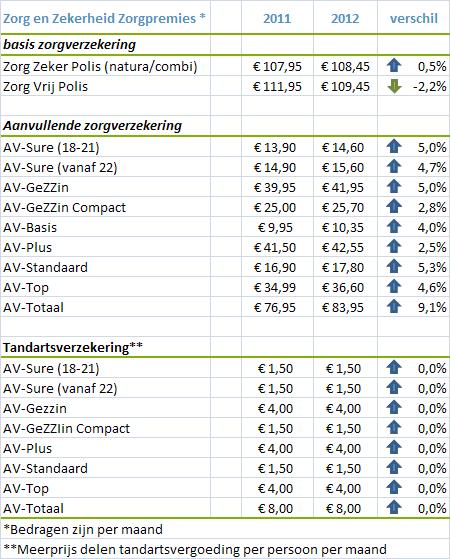 In onderstaand overzicht zijn de nieuwe zorgpremies 2012 te zien voor de basisverzekering en aanvullendeverzekering 2012.